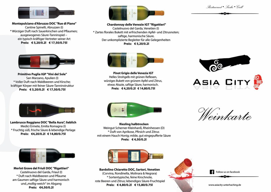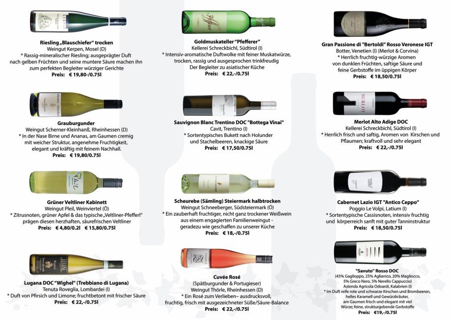 So sieht unsere Weinkarte aus, die wir expliziert für asiatische Fusionsküche ausgesucht haben. Probieren Sie es einfach Mal aus...